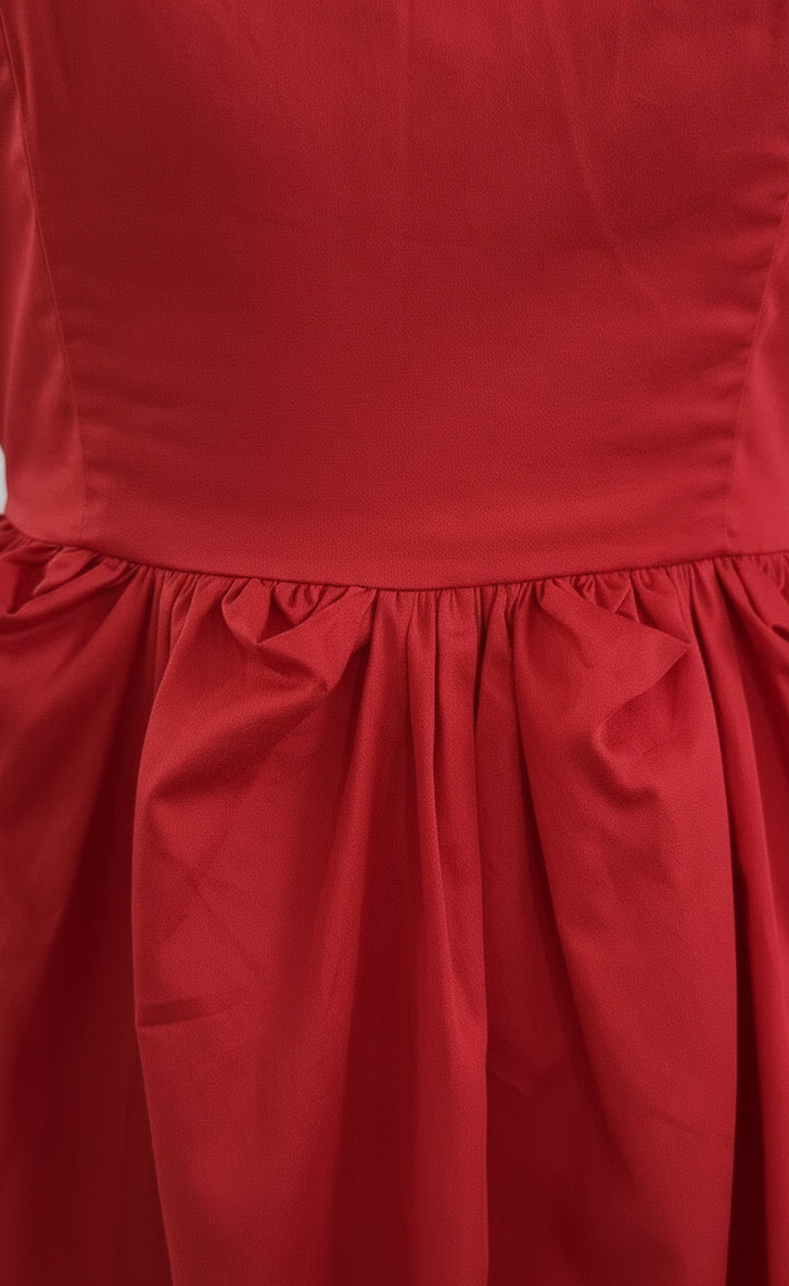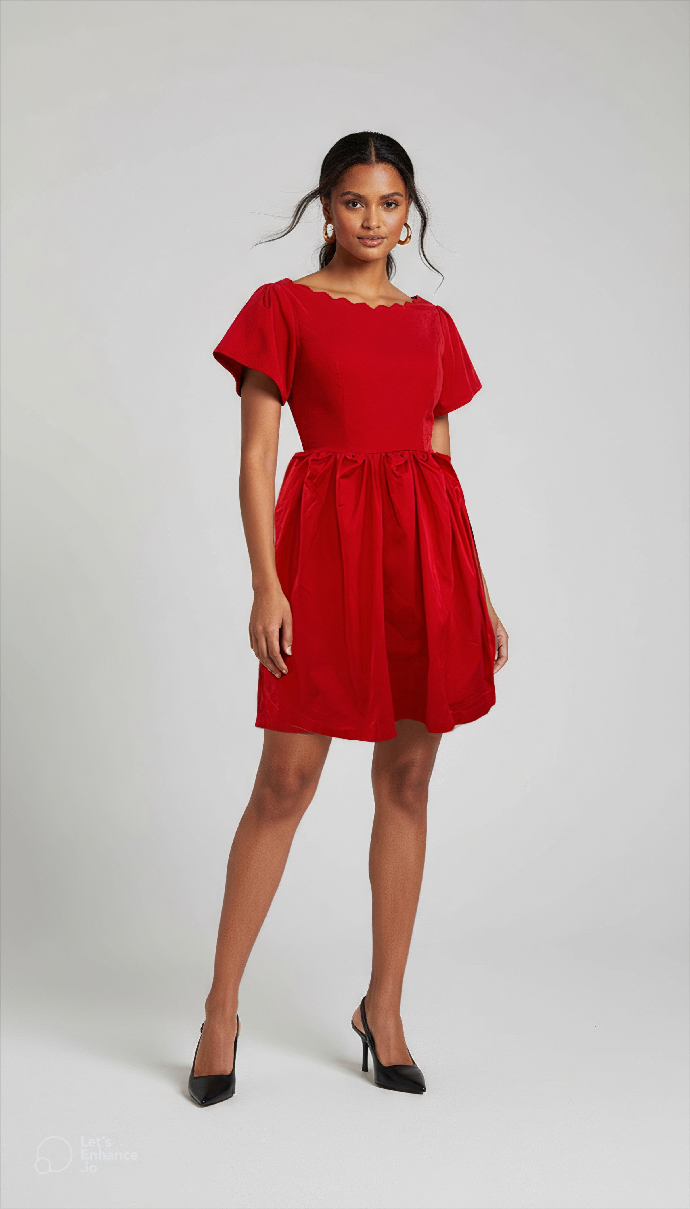 A quintessential of a party-ready wardrobe, this cocktail mini dress draws a scalloped edge along its wide bateau neckline. Cut in cotton satin accentuates its structural silhouette, from the short sleeves to the gathered waist giving its lustrous sheen a beautiful dimension. Its cinched waist draws your body in soft, feminine proportions.